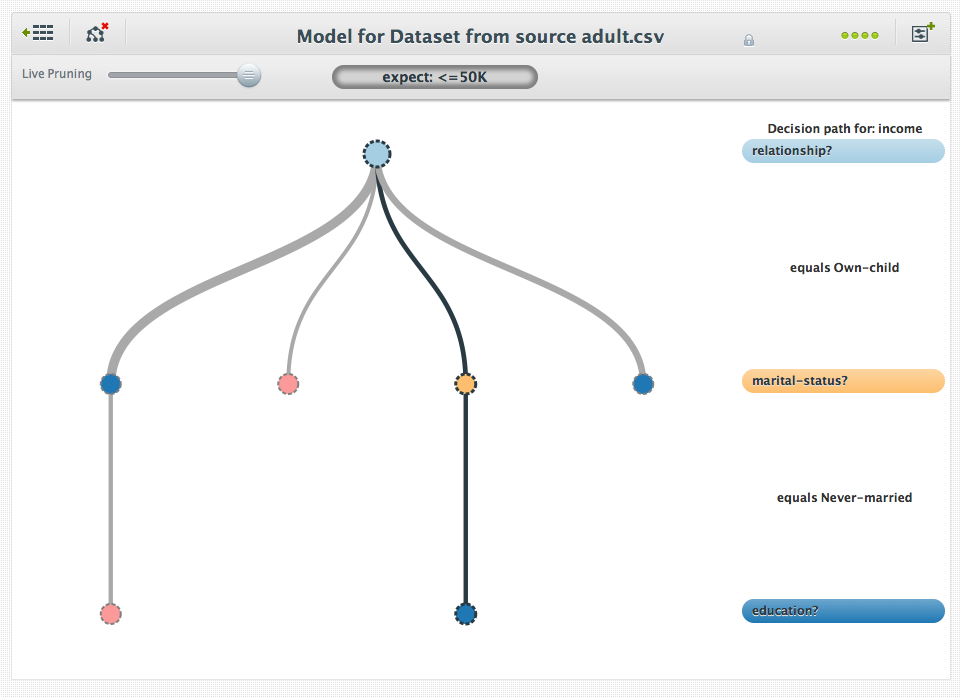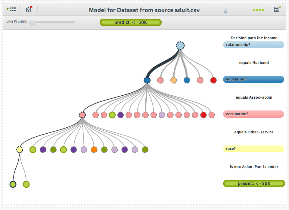 Whenever you highlight a path in the tree (shown by a thicker, darker line), the corresponding path information shows up on the right hand side.  For instance, this given model evaluates census information on individuals.  The first thing it looks at is relationship status.  In the current branch, this equals “Husband”.  Next, it will evaluate education, occupation, and age.  Reading from top to bottom, it’s easy to see the chain of questions and answers the decision tree used to come to a given prediction (in this case, predicting whether they make more than $50 thousand dollars a year).  A smaller popup tells you the data coverage for the given node, in terms of a percentage or a count.