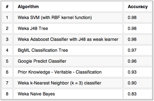 In summary, Google Prediction API comes out ahead in this analysis but not by much. This isn’t too surprising since Google’s service likely trains multiple black box models and chooses the best performer. BigML and Prior Knowledge, on the other hand, focus on single models that provide more insight into your data. Of course there are many other ways to look at the data, as they do in this JMLR paper, for example. I have included the raw results in CSV format along with the rest of the results in case you want to do your own analysis.