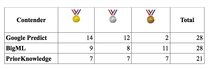 The Machine Learning Throwndown details contain the rest of the results as well as details about the datasets. Remember that the datasets are all relatively clean by machine learning standards. Also, these experiments do not exercise some advanced features described in my previous post such as predicting multiple fields with Prior Knowledge or handling strings with Google Prediction API.