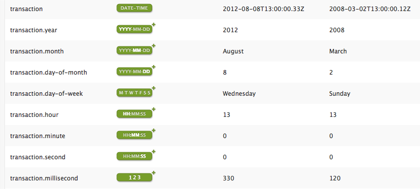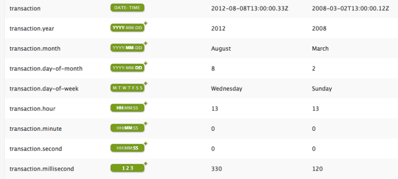 As of now, whenever we detect a date/time field in your source, we’ll automatically add a few fields. We’ll split the field into its respective parts (year, month, day, hour, minute, second and even millisecond) and add day of the week. This way your analysis can take into account that transactions peak on certain days of the week, periods of the year or even around specific times of the day. And it’s all done automatically. The one restriction we are applying at the moment is that your date(/time) conforms to ISO 8601. But hey, if you have a bunch of data that contains a different date type, let us know so we can look into it! ISO 8601 format is just a start.