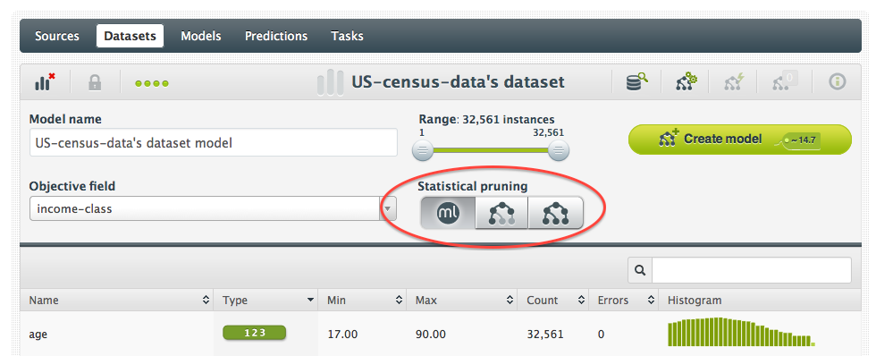 Our new version of the BigML backend has a lot of little improvements. One of these is the introduction of statistical pruning (or pessimistic pruning as seen in this slide deck).