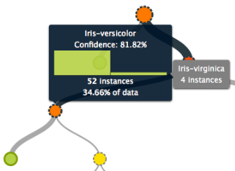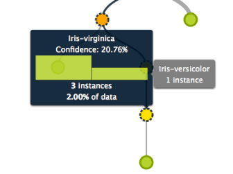 This node predicts ‘iris virginica’, based on three instances. Two instances with class ‘iris virginica’ and one with ‘iris versicolor’. The confidence is only 20.76%, mainly because of the low number of instances that support this prediction, but also because the majority class here is 2/3, whereas the previous case had a stronger majority.