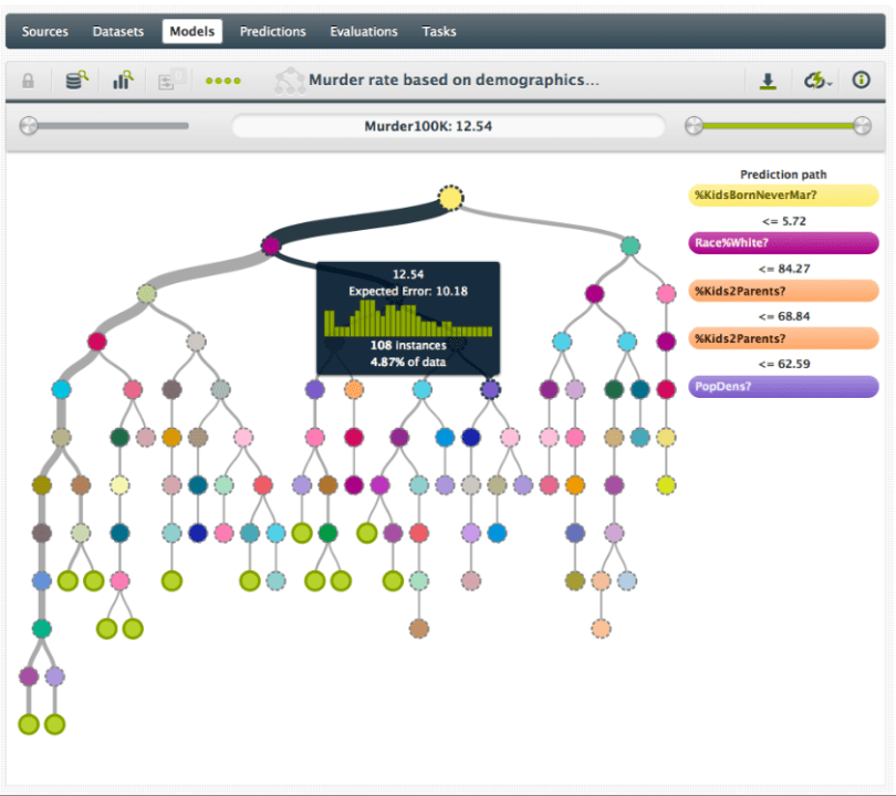 Using these numbers, we can create “confidence intervals” around some of the statistics at each node.  The idea is to give you a number that will probably underestimate the performance of your model.  So our confidence number for classification trees means essentially, “BigML is fairly certain that the prediction at this node will be right at least this percentage of the time”.  Similarly, the expected error for regression trees means that your average prediction error at this node will be almost certainly better than the number provided.  In short, these numbers are both pessimistic estimates of the truth.