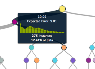 The expected error might not be the most useful number of you.  You might have other questions like, “What’s the possible range for the target value at this node?”, or “What is the probability that a target at this node will be greater than some value?”, or even “Is my error more likely to be skewed to one side of the prediction?”  To help answer those questions, the pop-up also shows you the distribution of those 275 instances. When you mouse over it, you’ll see the values in each bin of the histogram.