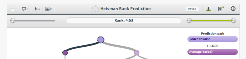 At BigML, we already have a number of sports related models, many of them available on our public gallery. For instance, here’s a BigML model that predicts the Heisman Trophy rank for a given candidate. This model only works for Heisman Trophy candidates, i.e. the top ten players that were considered for the trophy, for a given year, between the years that the trophy was awarded (1935-2011).