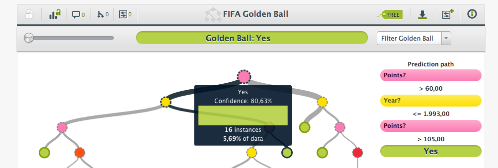 The Fifa Golden Ball is one of the most prestigious awards a single player can receive. It is given to the most outstanding player at a World Cup Final. In the relevant BigML model, we can see that accumulating 60 points would give you good odds of winning prior to 1993. However, to have good odds of winning in later years you would need over a hundred.