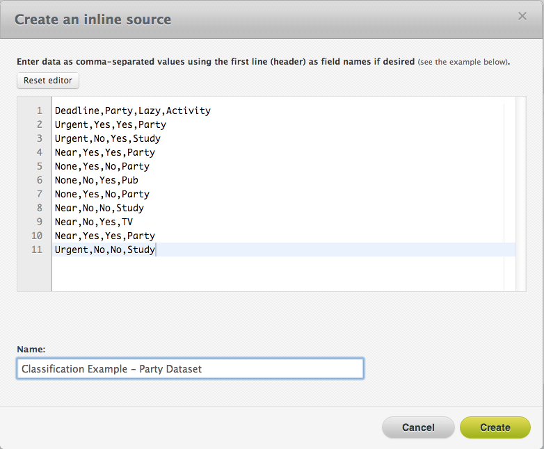 While developing and testing applications, you may want to manually create input data to simulate specific situations. To that end we have added an inline editor. Now you can create inline sources in BigML by manually inputting any data you like. Of course you can also copy/paste the content of an existing file and edit that data.