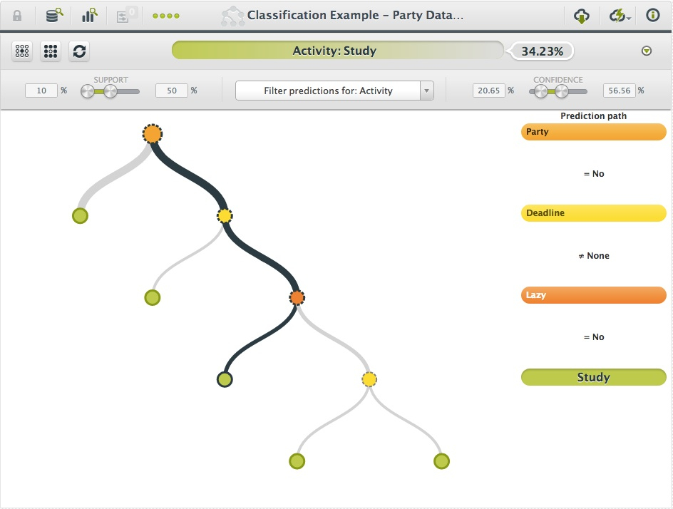 Inline sources might also be useful to help you understand how machine learning works in general and how BigML’s algorithm specifically behaves. Imagine that you are taking an introductory class on learning with decision trees and want to check how different data alters how the trees are built. You can now easily do that in a matter of clicks. In fact, the example above is the party dataset taken from Steven Marsland introductory book to machine learning from an algorithm perspective. See below the corresponding model.