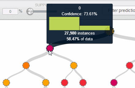 This is a common use for decision trees: gaining insight by finding the “best” nodes as measured by the fraction of data they cover (“support”) and their purity (“confidence”). When exploring a decision tree for insight, the goal is to find the smallest collection of useful rules that accurately summarizes your data.