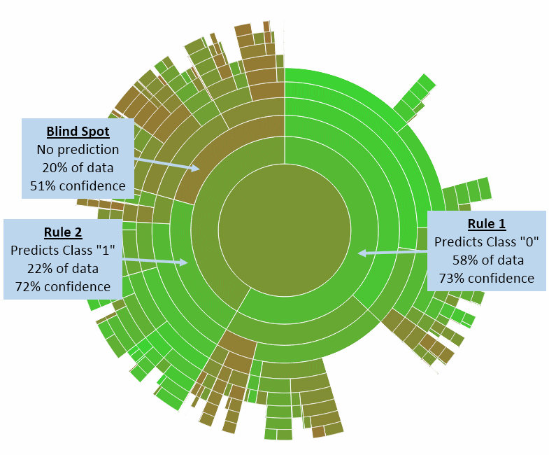 This one node covered 58% of the data, and separated the two classes with 73% confidence. (“Confidence” is a measure of node purity, and for this node 73% of the data belongs to class “0”.) With a little more work, I found another node that covered another 22% of the data, this time predicting class “1”. For the remaining 20% of data, the best rule I could find (after much mousing-over in the tree) was a single node with a lousy 51% confidence—barely an improvement over flipping a coin. I affectionately named these nodes Rule 1, Rule 2 and Blind Spot.