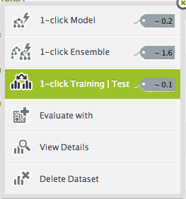 Now, in your dashboard, from the dataset listings or from an individual dataset view you have a new menu option to create a training and test set in only one click.  By default, the split for training and test set is 80/20. That is, 80% of the instances in the dataset will be used to create a new dataset suffixed with “training” and the other 20% of the instances will be used to create a new dataset suffixed with “test”.