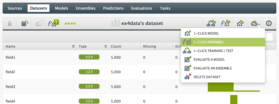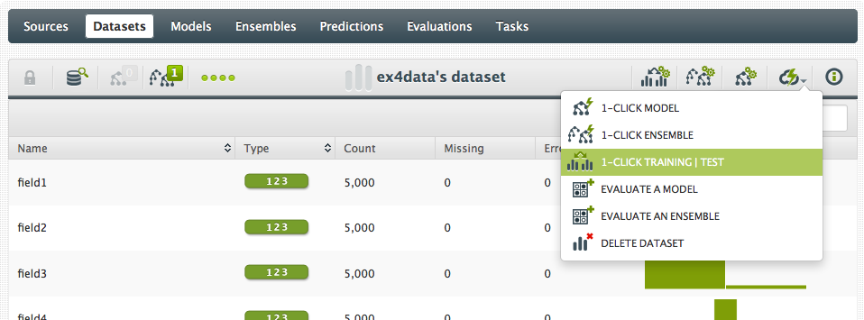 And now I have three datasets: the original “full” dataset, a “training” dataset containing a random 80% of the original dataset, and a “test” dataset with the remaining 20%. Now we can build the 1-click ensemble with the training set: