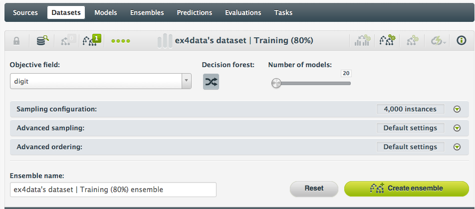 That’s it! We now have a Random Decision Forest in BigML for recognizing handwritten digits! So how does it perform compared to the Neural Network? The final step in the ml-class test was to evaluate the Neural Network over the training set, which we can do in BigML as well using an evaluation over the original dataset: