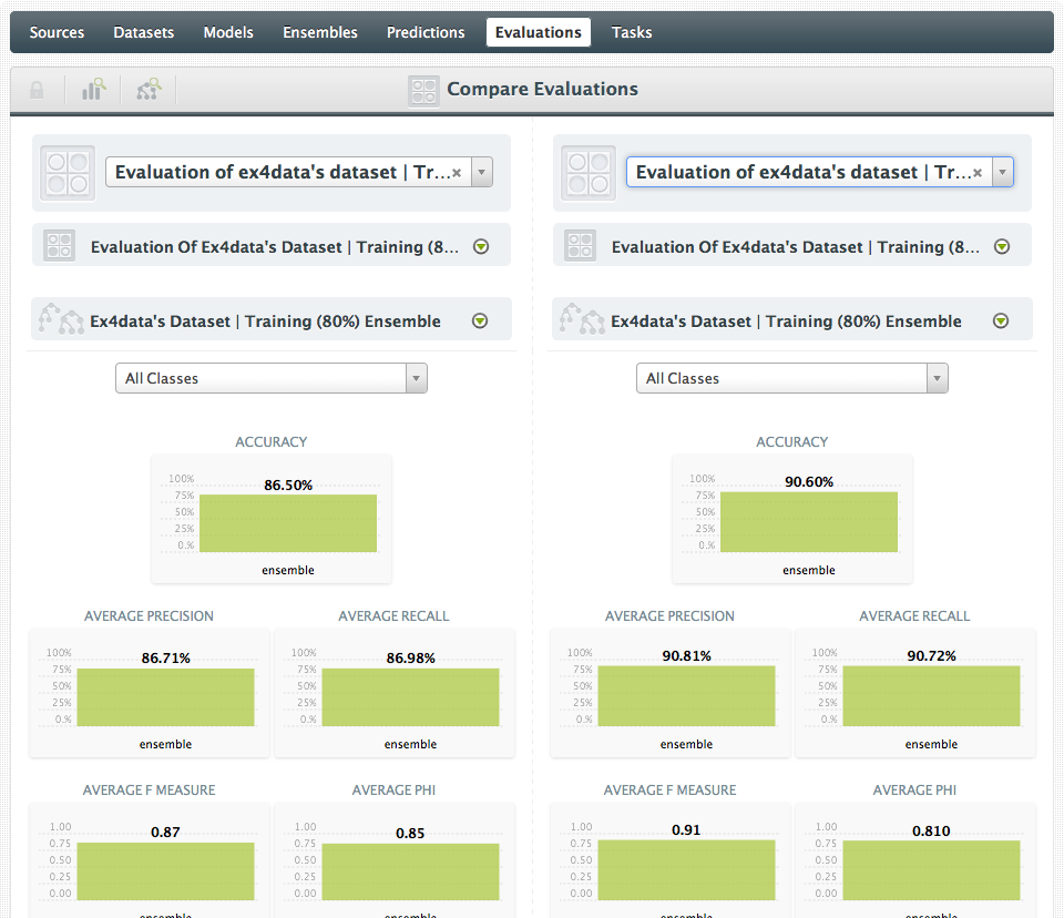 Finally, what if you want to see those two evaluations side-by-side? Yeah, BigML can do that too: