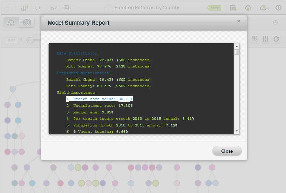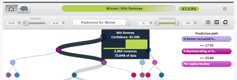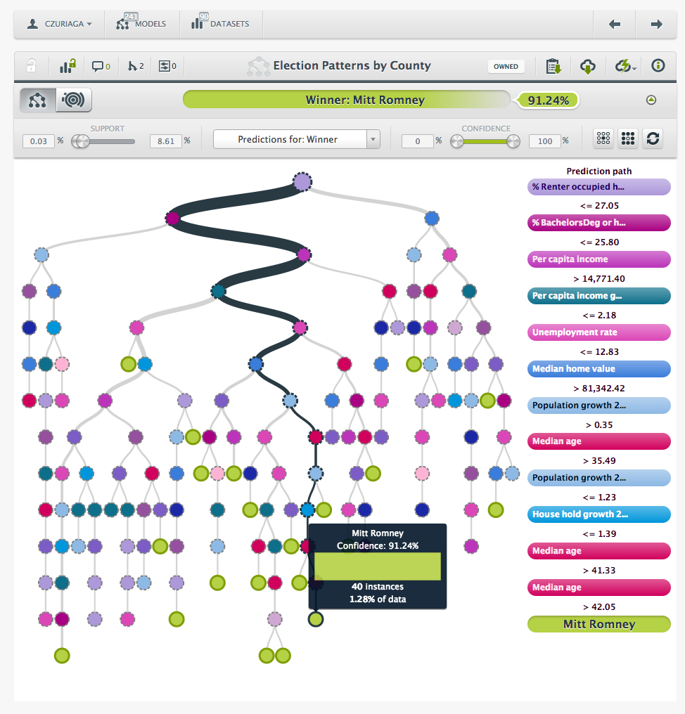While many (if not most) models built with BigML are done for predictive purposes, BigML is also very effective in analysis of historical data to uncover causal relationships between data, and to see how these relationships have influenced a net result. In this model, for example, we wanted to see how demographic and economic information influenced a candidate’s popularity in American counties. Plus, we think that guys like Nate Silver are already doing a pretty fine job of predicting election outcomes..