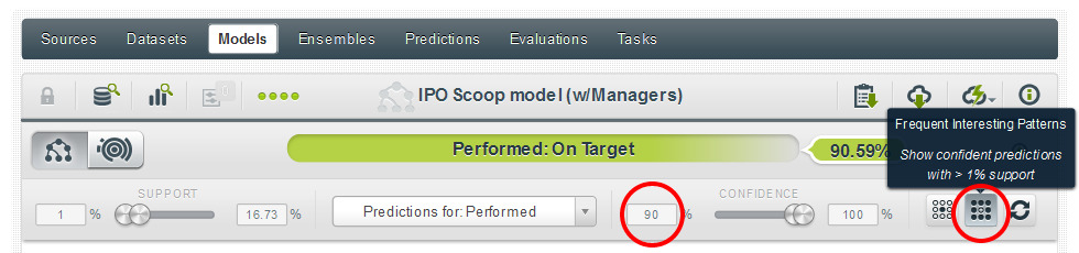 Working in the BigML interface, we used the Frequent Interesting Patterns quick filter to narrow the tree down to highly confident predictions with good levels of support (as an aside, this is the first step I personally take after building any model to get a quick sense for whether it will give me interesting results). And to limit our findings further, we decided to only seek predictions with 90%+ confidence of being on or above target—we did this by dialing the confidence slider up further.