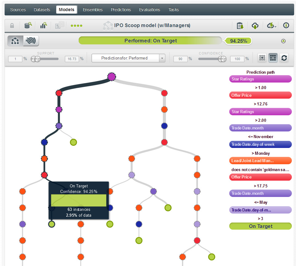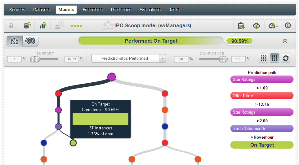 While many BigML users leverage our platform to analyze stock performance or portfolio blend, we thought it would be interesting to see if there are any underlying factors in IPO data that can be used to assess IPOScoop predictions. You can view and clone the full model here.; and the dataset here.