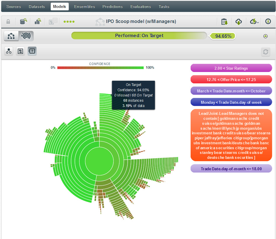 3) As we move even further down the left hand side of the tree we can see another interesting prediction—but this is summarized easier by using the Sunburst view. And as you see below, this prediction tells us that a Performed rating for a 3+ star stock offered between $12.77 and $17.225 that is traded on a Tuesday-Friday before the 18th of any month between April and October and was not managed by one of several firms listed, has a 94.65% confidence of being accurate.
