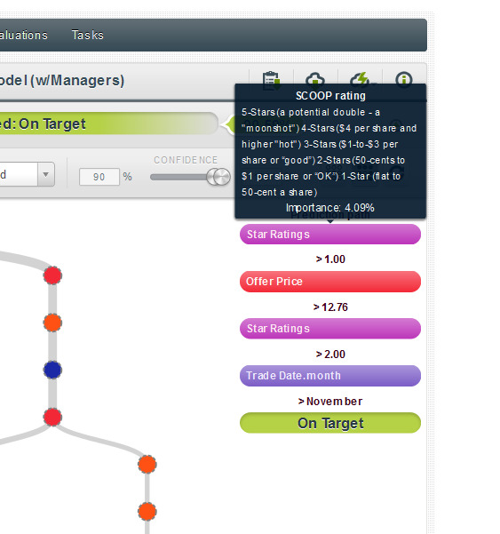 1) Here we see that we have a 90.59% confidence rating in a Performed prediction for a stock with a star rating of 3 or better and that is issued in December with an offer price above $12.76: