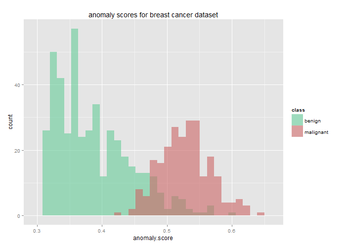 Finally, we can simply compare the histogram of anomaly scores for malignant and benign biopsies. This clearly shows how well the anomaly score lines up with the biopsy results!