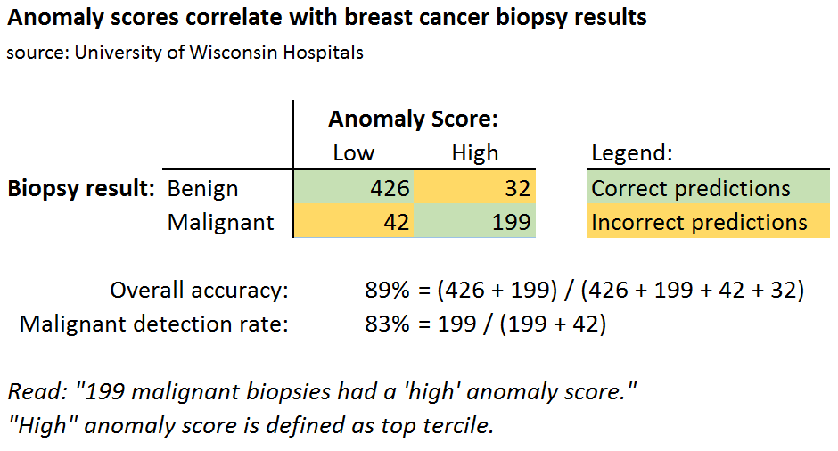 Another way to see the power of anomaly detection is to predict the outcome of a biopsy using only the high/low anomaly attribute. This correctly predicts the result 89% of the time, and detects 83% of malignant biopsies. Again, not bad considering the anomaly detector has no idea which examples are actually benign or malignant!