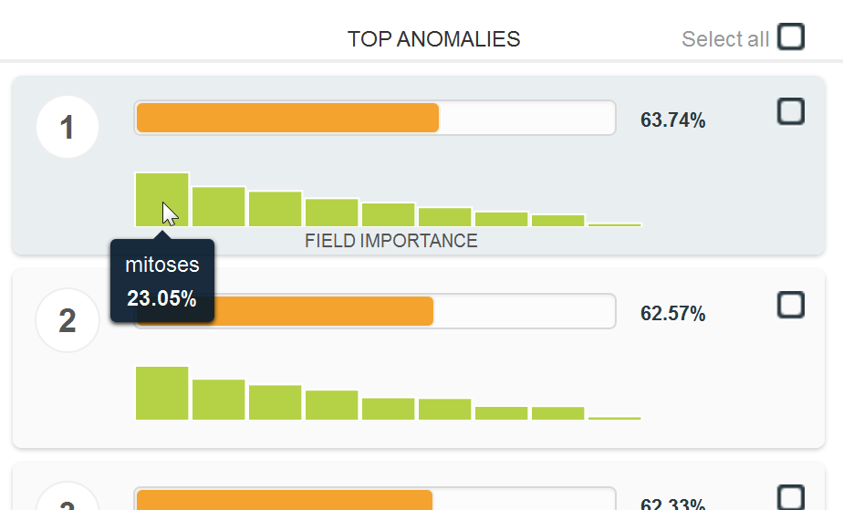 BigML makes it simple to create a dataset with only the measurements and not the “benign” or “malignant” labels. We then train an anomaly detector on this unlabeled data, and BigML displays the 10 biopsies with the highest “outlier-ness”: