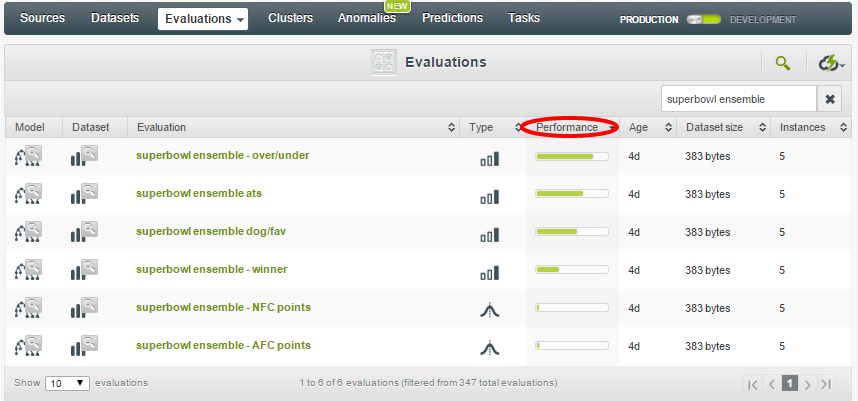 As the data is so limited it’s not surprising that single models for any outcome evaluated poorly — we had to build 100-model ensembles to achieve evaluations that performed better than mode or random guessing. Even then, it’s important to note that the hold-out set (using a standard 80/20 train/test split) only has a handful of instances. I was curious to see how my evaluations stacked up, so I used BigML’s handy new tweak to the interface that allows you to sort evaluations by their performance (I also leveraged the search feature to filter for “superbowl ensemble”):