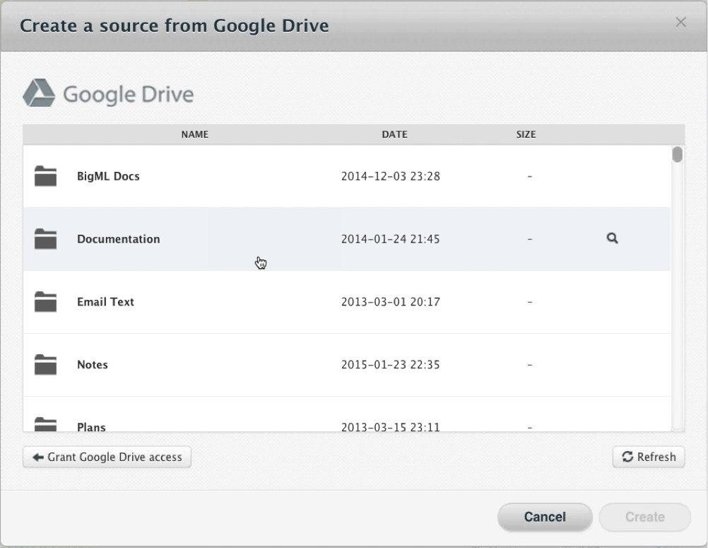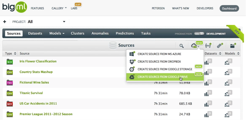 Since our aim is to make it super easy to upload your data to BigML regardless of your cloud provider, we have added both Google Drive and Google Storage support as well. Similar to our integrations with Azure Marketplace and Dropbox, connecting to your cloud storage only takes few clicks starting from the cloud icon located on the Sources tab.