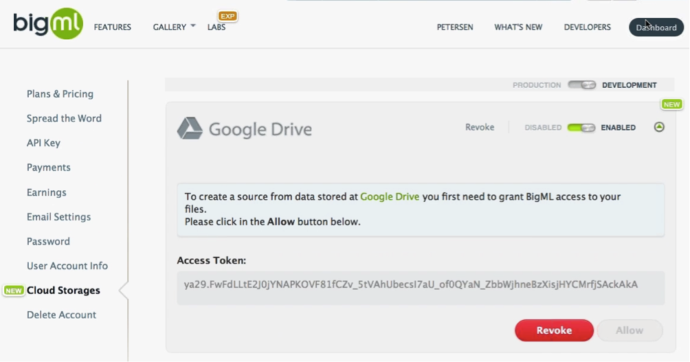 The first time you go through this flow, you will be asked to allow BigML to access your Google Drive or Storage, which automatically generates and displays an access token.