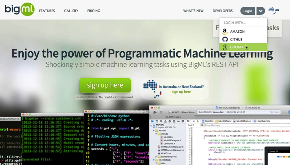 For starters, in addition to Amazon and GitHub, you can now login to BigML with your Google ID. Click on the Google option under the Login button and you will be authenticating right in to start with your machine learning project.