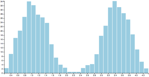 Finally, G-means uses the Anderson-Darling test to determine whether the projected points have a Gaussian distribution. If they do the original cluster is kept and the two candidates are rejected. Otherwise the candidates replace the original. In our example the distribution is clearly bimodal and fails the test, so we throw away the original and adopt the two candidate clusters.