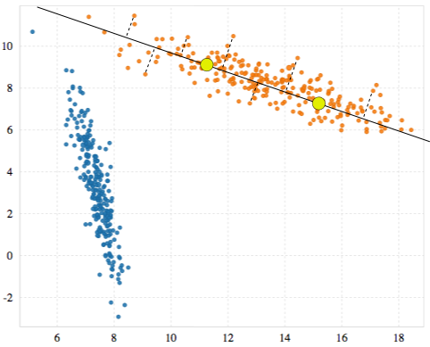 After G-means decides whether to replace each cluster with its candidates, it runs the K-means update step over the new set of clusters until their positions converge. In our example, we now have two clusters and two neighborhoods (the orange points and the blue points). We repeat the previous process of finding candidates for each neighborhood, making a vector, projecting the points, and testing for a Gaussian distribution.