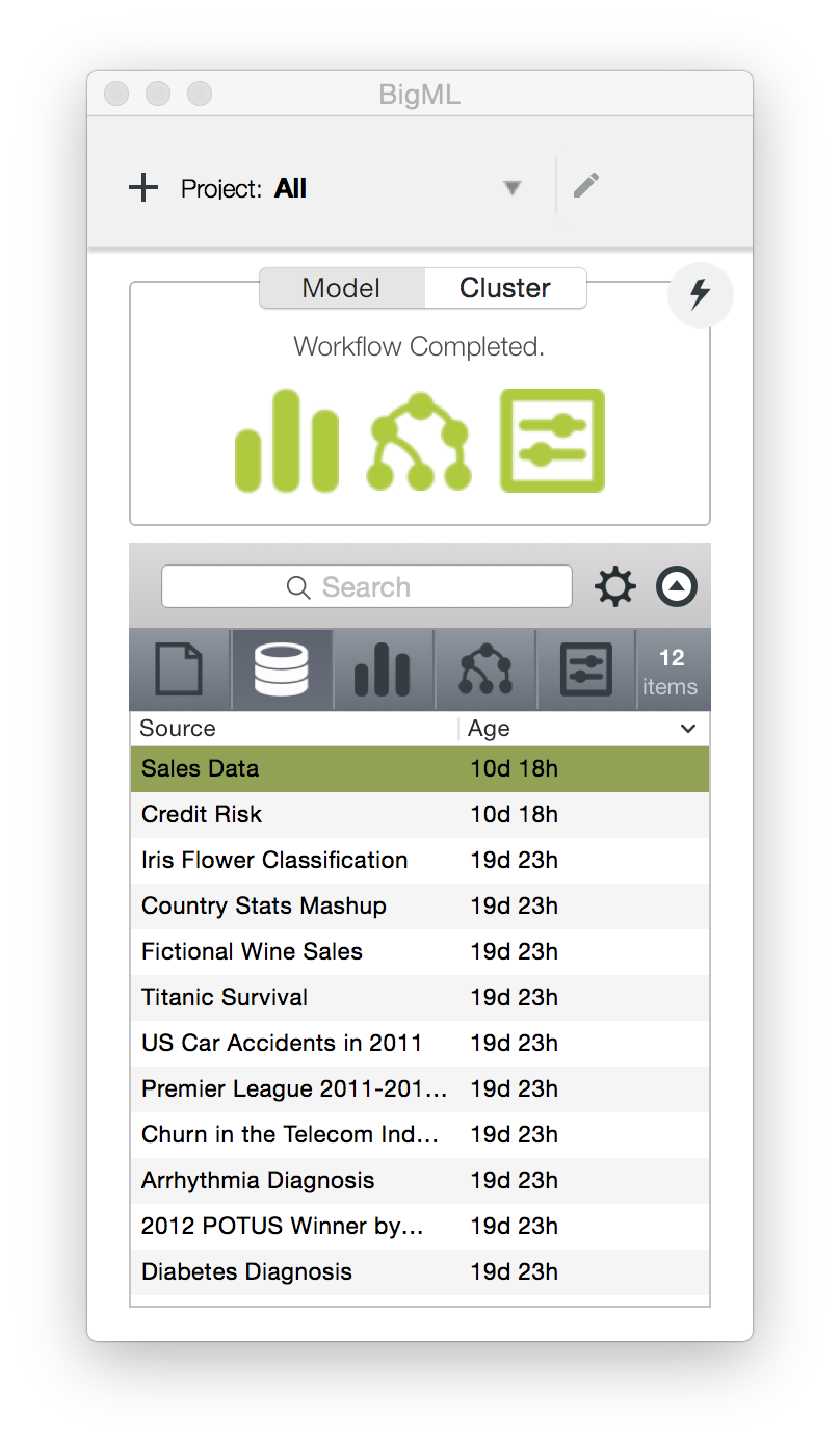As mentioned above, when you drag a source file over to BigML, a set of resources is created remotely that is also mirrored locally. The Resource Browser allows you to keep an eye on the resources as you create, delete or rename them, and even when you use them to create new predictions, so you do not have to start over every time.