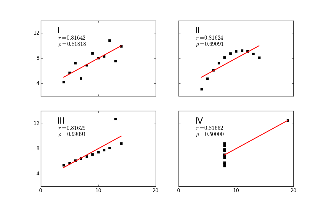 In cases such as this, Spearman’s rank-correlation coefficient, or Spearman’s rho, may be a good alternative measure. Spearman’s rho quantifies how monotonic the relationship between the two variables is, i.e. “Does an increase in x usually result in an increase in y?” (technically it is equivalent to computing Pearson’s r for a rank-transformed version of the data). We can see that while the four Anscombe datasets have equivalent Pearson’s r, Spearman’s rho does a good job discriminating them.
