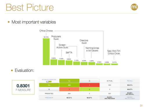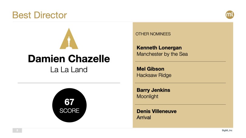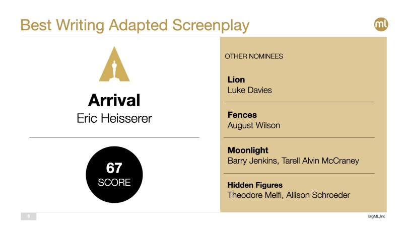 Machine Learning is accelerating its transition from academia to industry. We see more and more media outlets reporting about it, but most of the time they exclusively focus on the final results and not in all the human-powered tasks that happen behind the scenes and that really make the magic possible. So for most people Machine Learning continues to be some sort of elusive magic. We were recently approached by One, the Vodafone-sponsored section of El Pais, to explain how Machine Learning works and, after giving it some thought, we decided to explain it using a simple example in a domain everyone is familiar with. As the 89th annual Academy of Motion Picture Arts and Sciences Award ceremony draws near and movie fans all over the world are getting ready for their office pools, we couldn’t resist the temptation to take a stab at predicting the 2017 Oscars by applying some BigML-powered Machine Learning courtesy of our own Teresa Álvarez and Cándido Zuriaga.