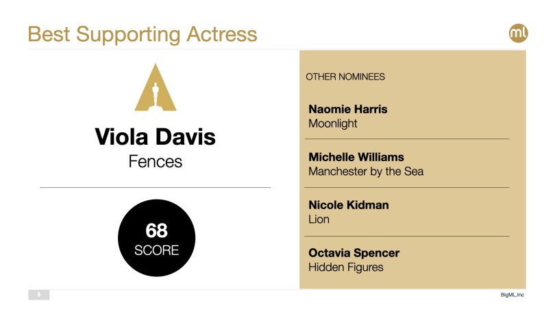 Best Supporting Actor award is another category with a number of viable choices. Our pick is Mahershala Ali (Moonlight). Most critics seem to be highlighting Mahershala Ali and Dev Patel as the favorites in this category as well. Mahershala Ali is somewhat handicapped by the model since he wasn’t able to pick up the Golden Globe for this category, which translates into a rather low confidence value for this prediction. Interestingly, the Nocturnal Animals actor Aaron Tayor-Johnson won the Golden Globe, but he is not even a nominee for the Oscars. Actually, in one of our preliminary models we made the mistake of inputing the Golden Globes wins for Michael Shannon and as it has been nominated to best supporting model, our model predicted him as the winner. This was helpful to remind us how careful you need to be not only collecting and cleaning the right data for training your models, but also making sure you input the right one at prediction time.