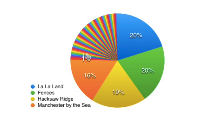 Our Boosted Trees predict… drumroll please… four different actors might win the Oscar! That is, four different actors have a very good chance of winning. Let’s see who we have: Ryan Gosling in La La Land, Denzel Washington in Fences, Andrew Garfield in Hacksaw Ridge, and finally Casey Affleck in Manchester by the Sea.