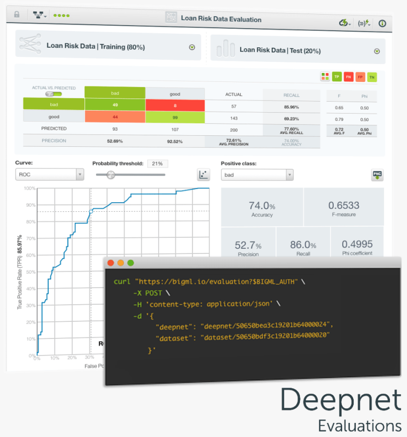 As any other supervised learning model, you need to evaluate the performance of your Deepnets to get an estimate of how good your model will be at making predictions for new data. To do this, prior to training your model, you will need to split your dataset into two different subsets (one for training and the other one for testing). When your Deepnets model is trained, you can use your pre-built test dataset to evaluate its performance and easily interpret the results with BigML’s evaluation comparison tool.