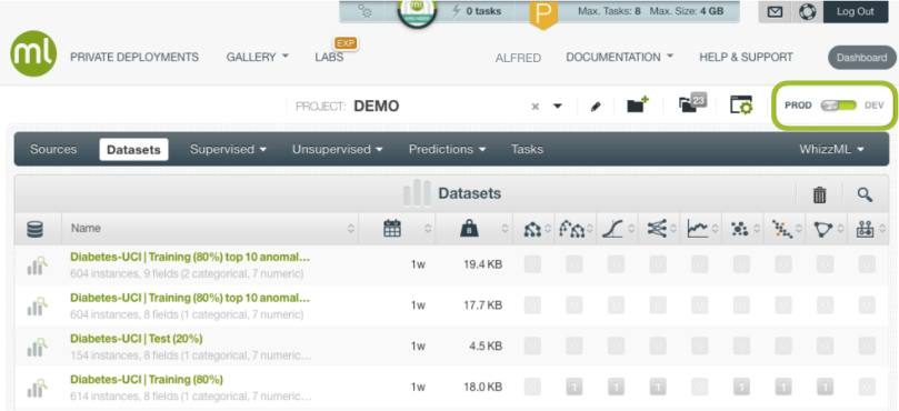 To nip the obvious question in the bud, you will still have full access to your DEV resources as we will move DEV resources to the same environment as PROD resources under a new project named “BigML DEV Resources Archive”. That also means if you had a FREE BigML account or have been benefiting from a free account under our Education program, you will keep having uninterrupted access to all your resources without charge. If you already had DEV resources organized in various projects you’ve named yourself, we will preserve those projects as well. Furthermore, to avoid potential collisions in terms of project names between DEV and PROD environments, we will tag your migrated DEV projects as “dev-archive” so you can filter them easily by using the keywords “tags:dev-archive”.