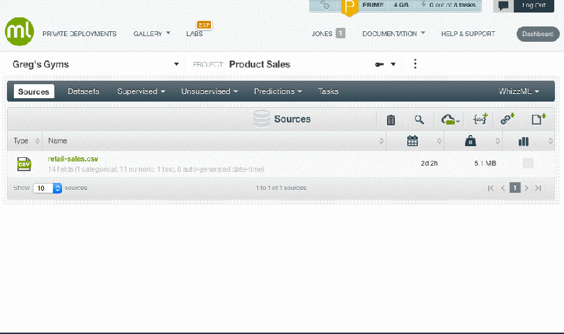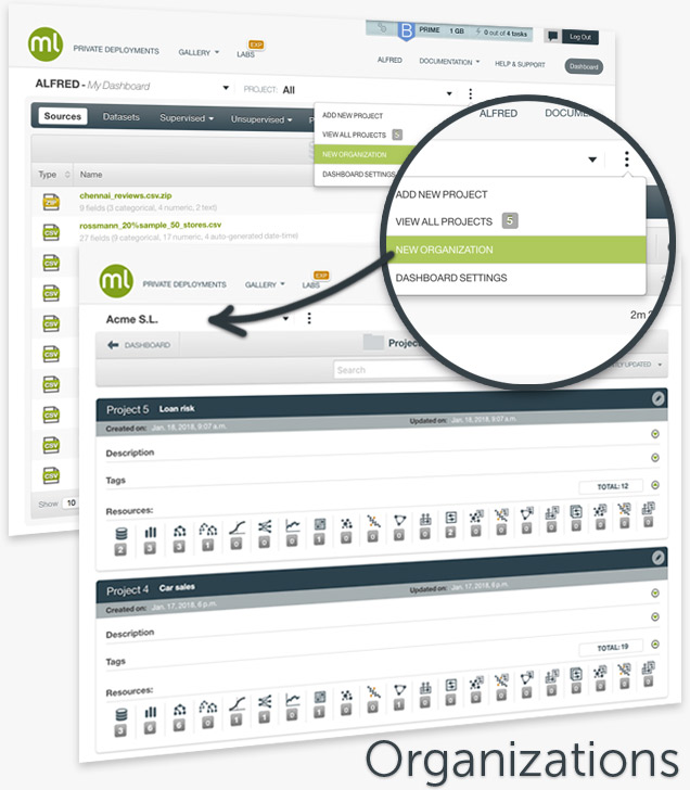 When Jones is working in his personal account (My Dashboard) he will enjoy his personal BigML subscription; when he is working in the “Greg’s Gyms” organization, he will enjoy the organization’s subscription. Resources can be transferred from his private Dashboard to an organization.