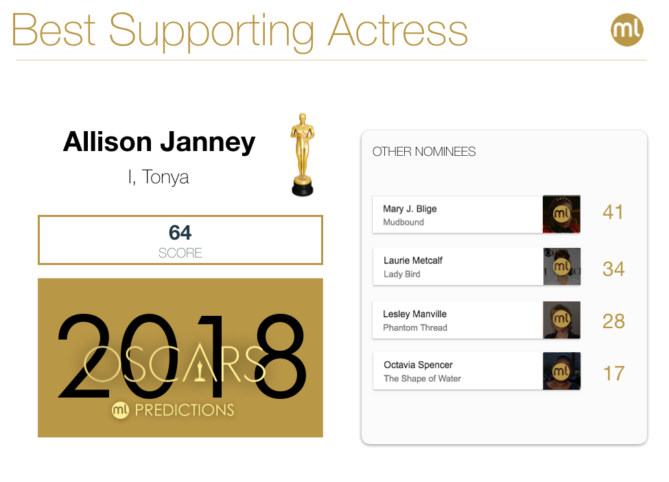 Among the five nominees for the Best Supporting Actress, the model favors Allison Janney for her role in I, Tonya with a 64 score.