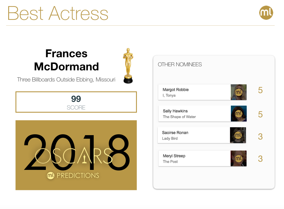 Similarly, for Best Actress, there seems to be little competition. Frances McDormand is the undoubtedly the favorite with a 99 score. Far behind, we can find Margot Robbie with a score of 5.