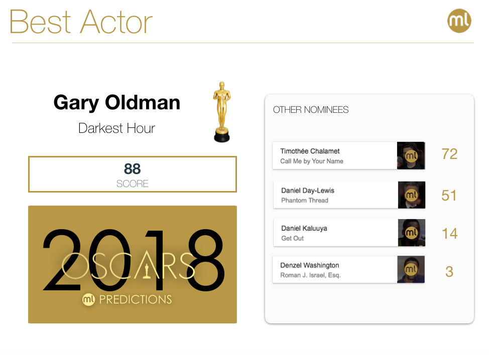 Gary Oldman is predicted by the model as the winner for Best Actor with a score of 88 for his amazing transformation as Winston Churchill in the Darkest Hour. However, he will need to subdue Timothée Chalament, the up-and-comer from Call Me By Your Name, who shows a score of 72 to win according to the model. Another strong rival is the consummate professional Daniel Day-Lewis with a score of 51 to win the award for his role in Poul Thomas Anderson’s film, Phantom Thread.