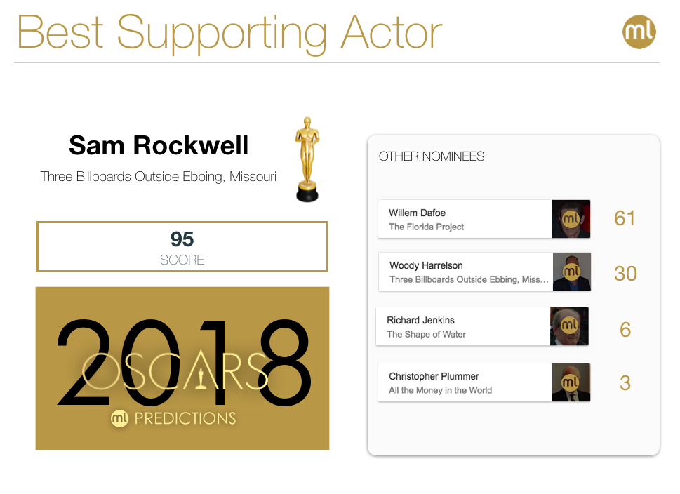 The Best Supporting Actor category has more competition, however, Sam Rockwell seems the clear favorite for his role in Three Billboards Outside Ebbing, Missouri with a 95 score. With that said, Willem Dafoe has also a decent chance for his performance in The Florida Project with a score of 61.
