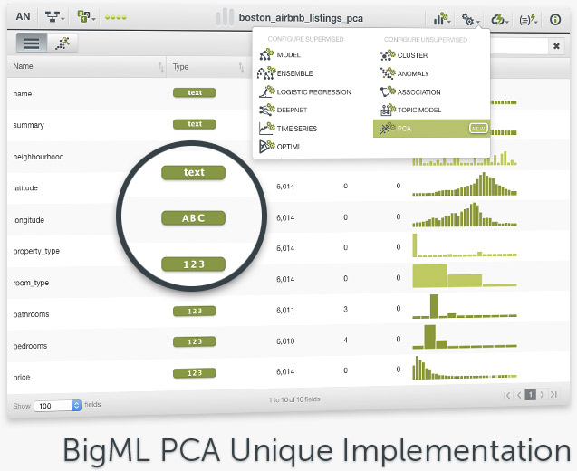 BigML PCA is distinct from other implementations of the PCA algorithm, our Machine Learning platform lets you transform many different data types in an automatic fashion that does not require you to configure it manually. That is, BigML’s unique approach can handle numeric and non-numeric data types, including text, categorical, items fields, as well as combinations of different data types. To do so, BigML PCA incorporates multiple factor analysis techniques, specifically, Multiple Correspondence Analysis (MCA) if the input contains only categorical data, and Factorial Analysis of Mixed Data (FAMD) if the input contains both numeric and categorical fields.