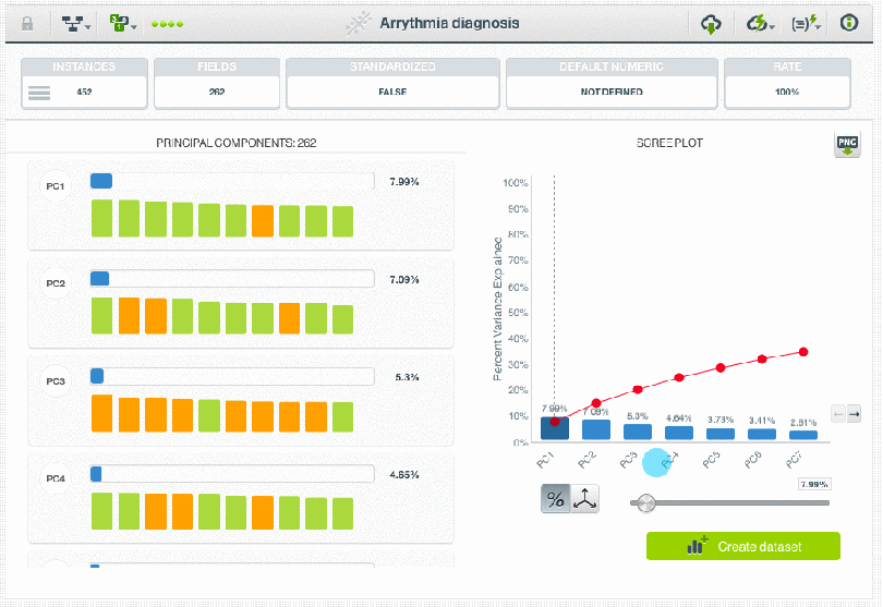 Principal Component Analysis (PCA), available on the BigML Dashboard, API and WhizzML for automation as of December 20, 2018, is a statistical technique that transforms a dataset defined by possibly correlated variables (whose noise negatively affects the performance of your model) into a set of uncorrelated variables, called principal components. This technique is used as the first step in dimensionality reduction, especially for those datasets with a large number of variables, which helps improve the performance of supervised models due to noise reduction. As such, PCA can be used in any industry vertical as a preprocessing technique in the data preparation phase of your Machine Learning projects.