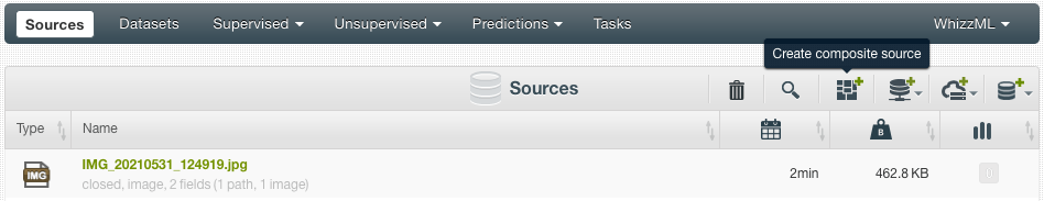 Of course, you can also use BATCH PREDICTION to classify multiple images. First, you need a dataset containing the images so click on “Create composite source” on the action bar in the source list view: