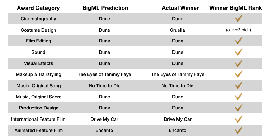 We found that we could have achieved even better results if we stuck to averaging the Top 10 OptiML models which would yield 17 hits out of 19 for a hit rate of almost 90%. Only the Best Picture and the Best Original Screenplay results would be incorrect while Best Adapted Screenplay and Best Costume misses would be reversed. Considering how easy it is to run an OptiML model search (it’s really one single click folks) once you have created a dataset, we can truly talk about bringing Machine Learning to the masses.