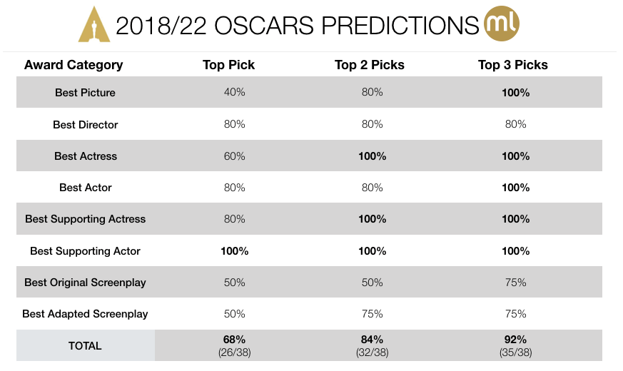 With modifications to our data and approach, this year’s prediction challenge turned out a fruitful one as we had 15 out of 19 predictions correct for a pretty decent hit rate of 79%! In fact, we’ve never had 15 right picks before as there were some question marks as to whether some of the more technical categories we chose to add for the first time would prove predictable. Although a single year can be misleading, we have a good reason to continue including the newly added categories going forward.