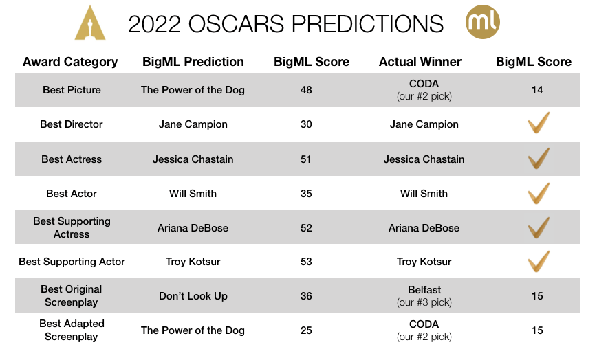 This year, since we opened up our Oscars Prediction Challenge to all of our community, quite a few of you have submitted predictions based on a wide variety of approaches such as Machine Learning modeling, gut feeling, as well as unofficially polling movie critic opinions. We’re happy to report that BigML’s own Alfonso Amayuelas got 15 of 19 picks right as well. Of the participants that didn’t apply ML, Ivana Guraieb Galland got 5 out of 6 picks correct. We’ll continue using this “crowdsourced” approach in the coming years.